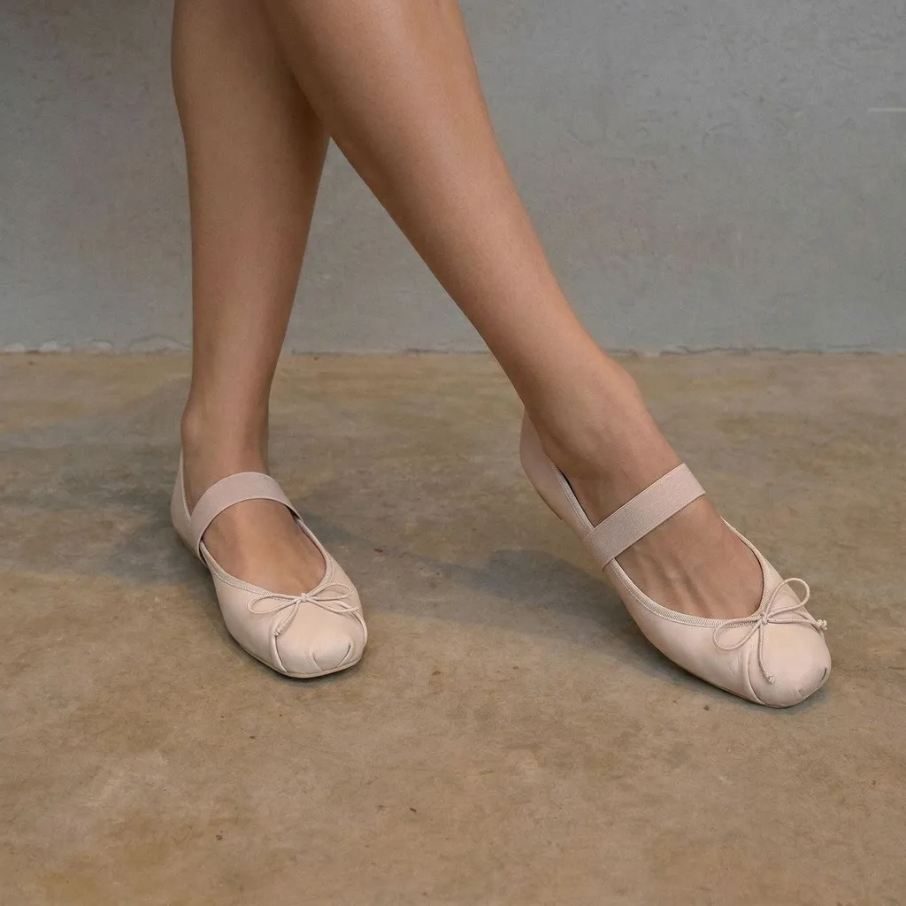 נעלי בלרינה מעור מט בצבע ורוד, עם גומי ופפיון תואמים יתנו לכן לרגיש כמו בלרינות אמיתיות