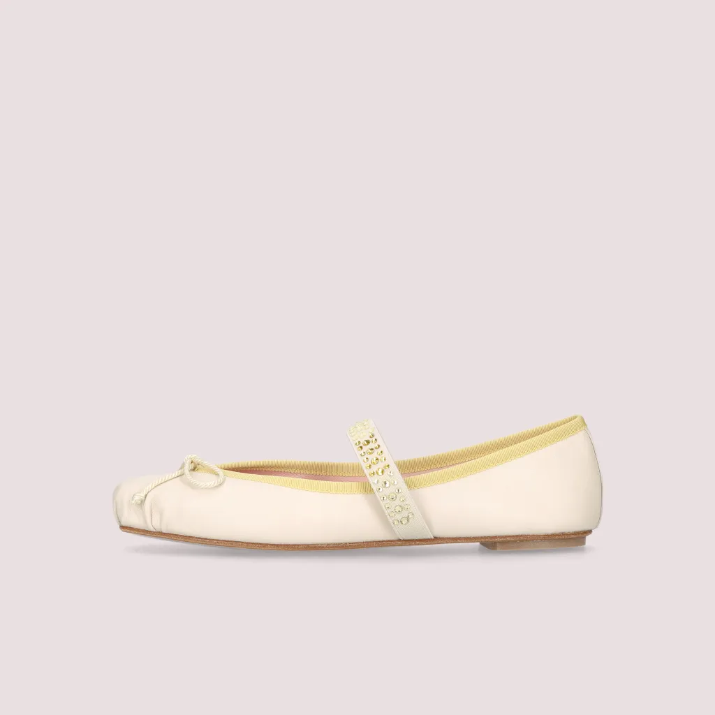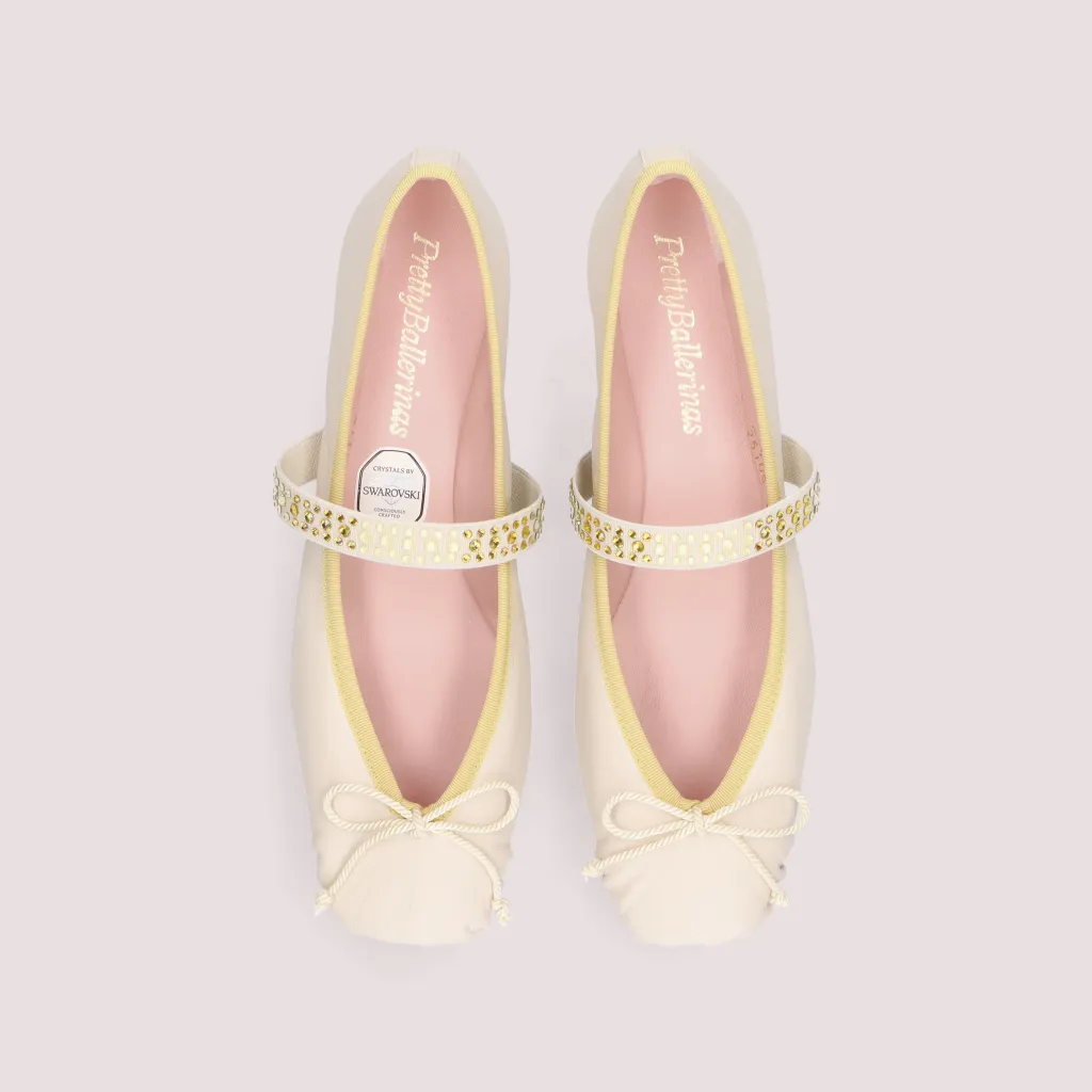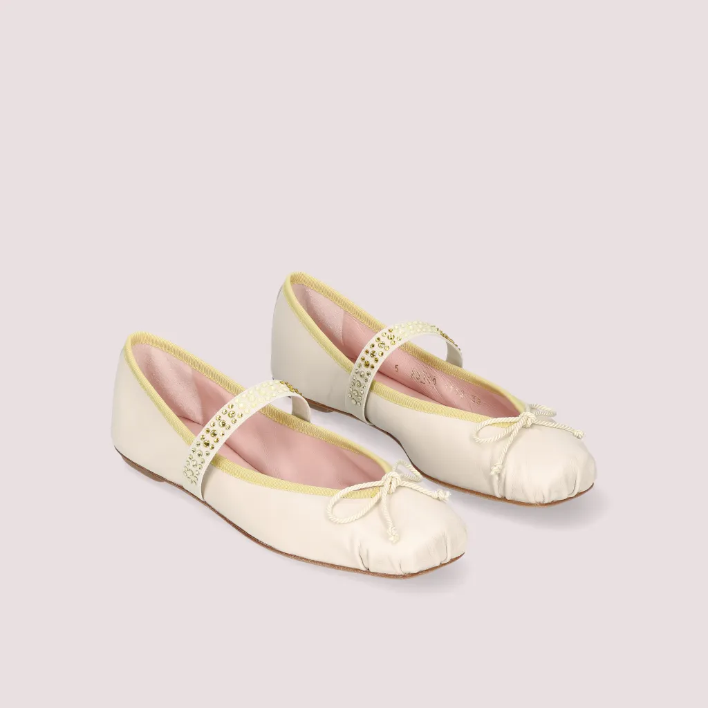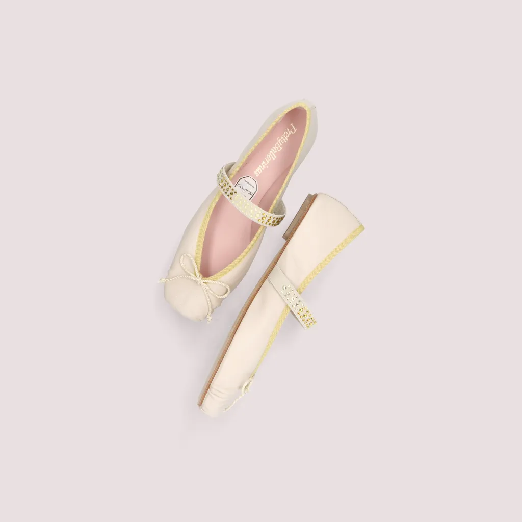 נעלי בלרינה מעור מט בצבע פנינה. עם סרט צהוב וגומי בצבע פנינה משובץ באבנים בגווני הצהב