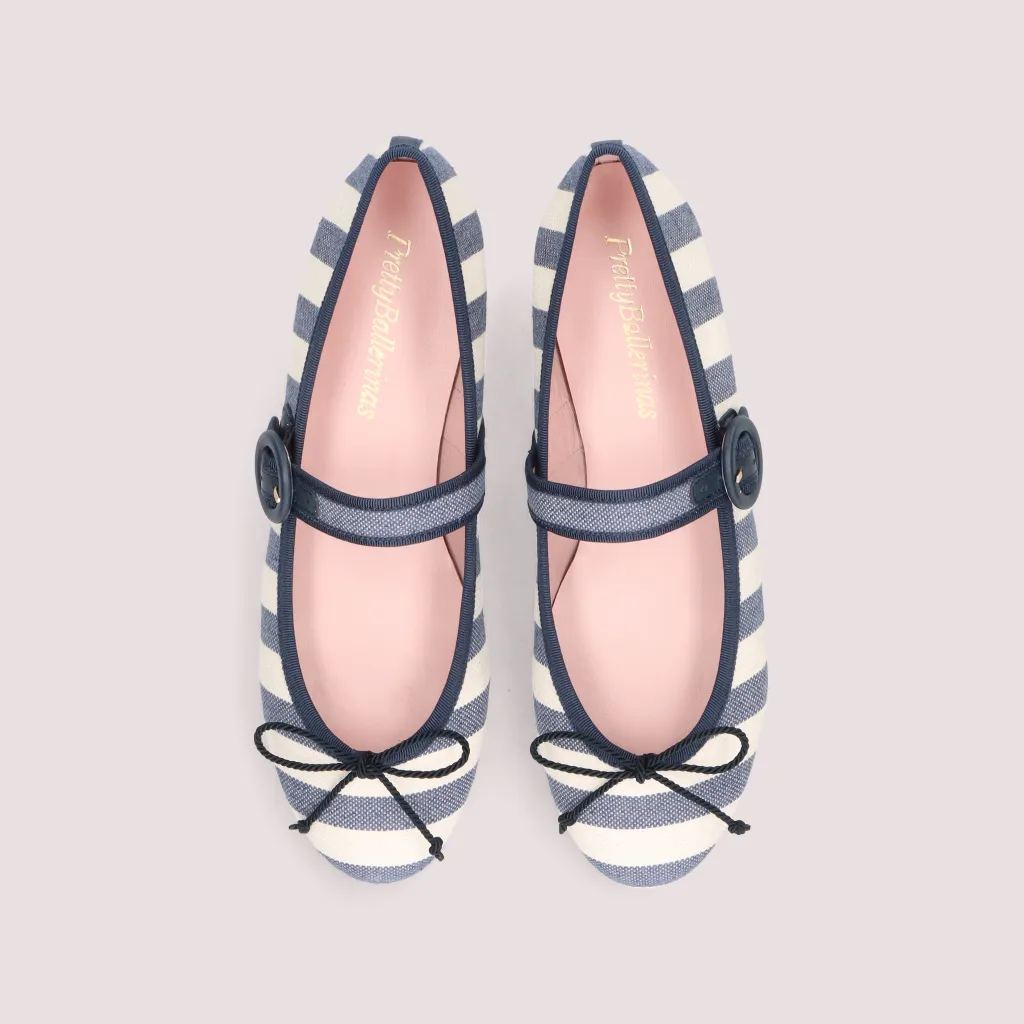 נעלי בלרינה מטקסטיל פסים כחול לבן עם רצועה תואמת ואבזם הניתן להתאמה ושרוך וסרט תואמים