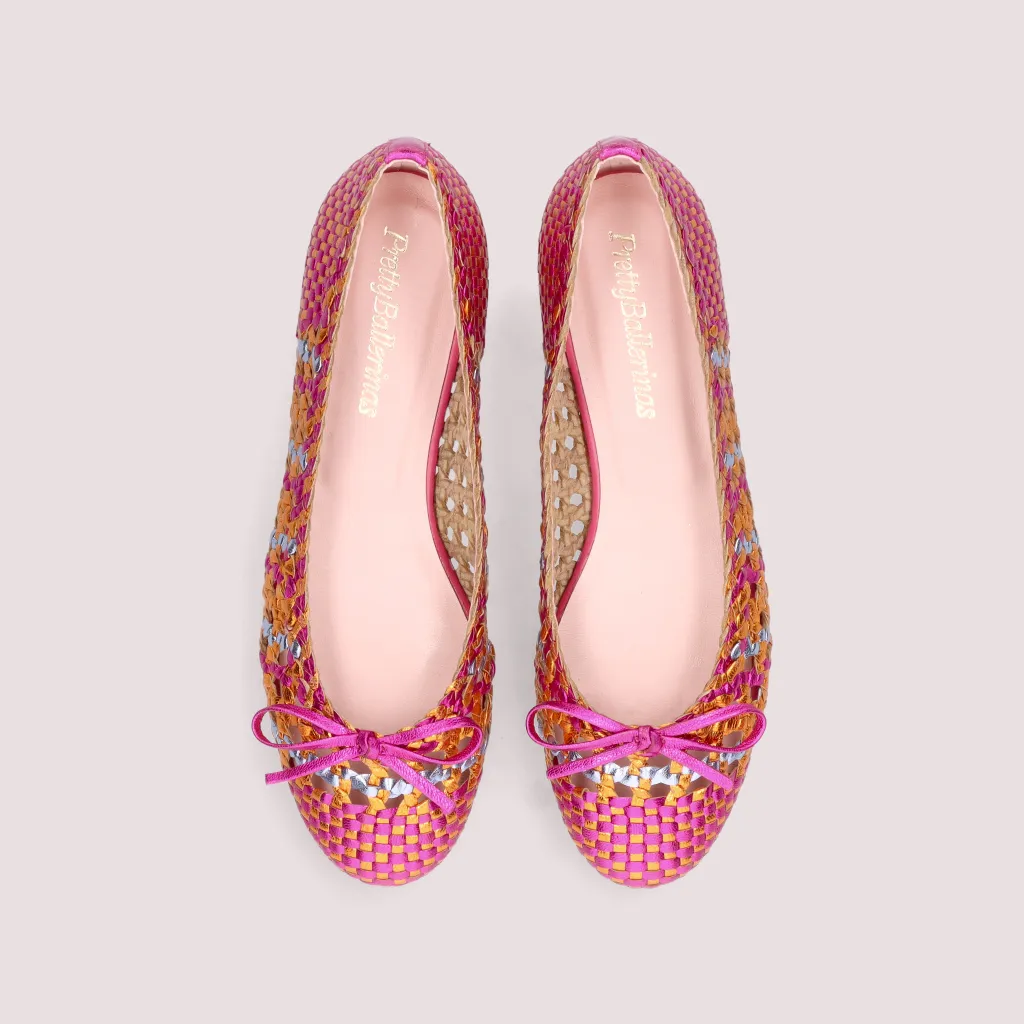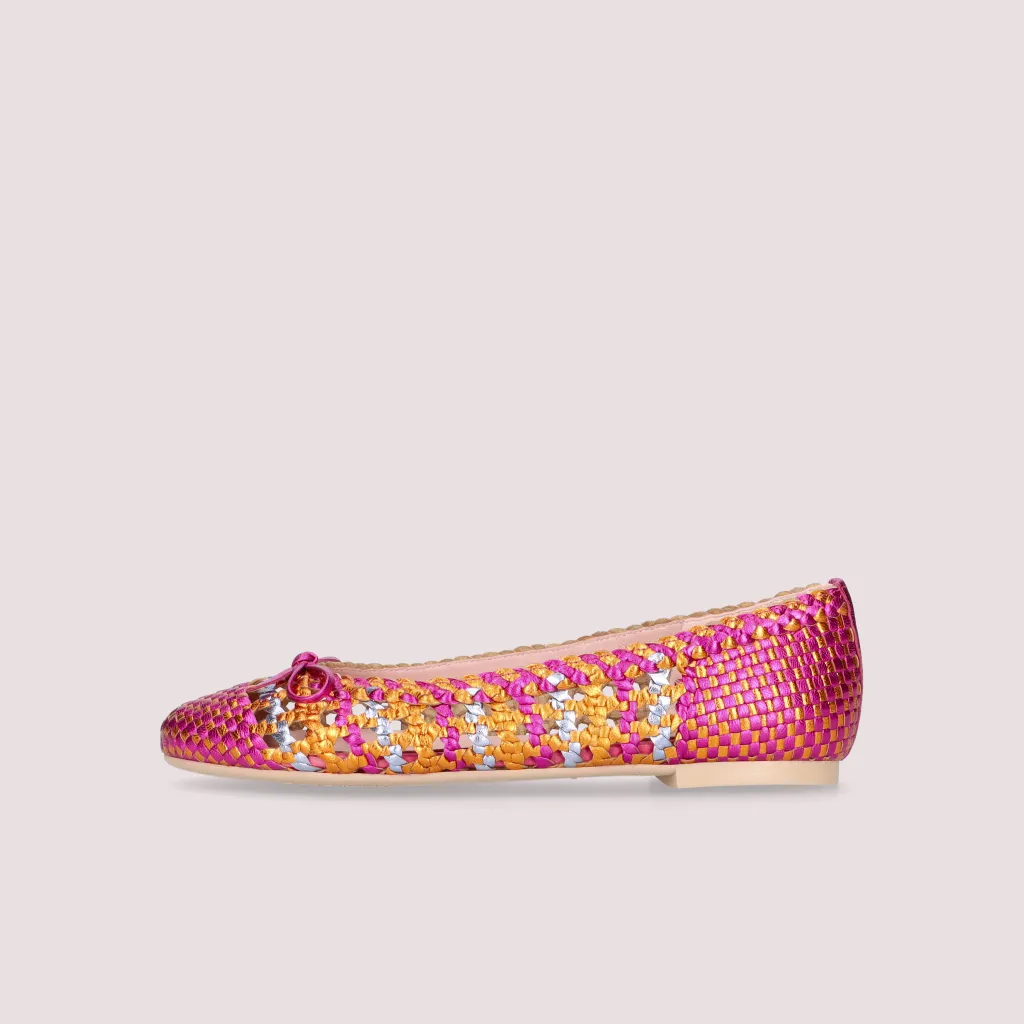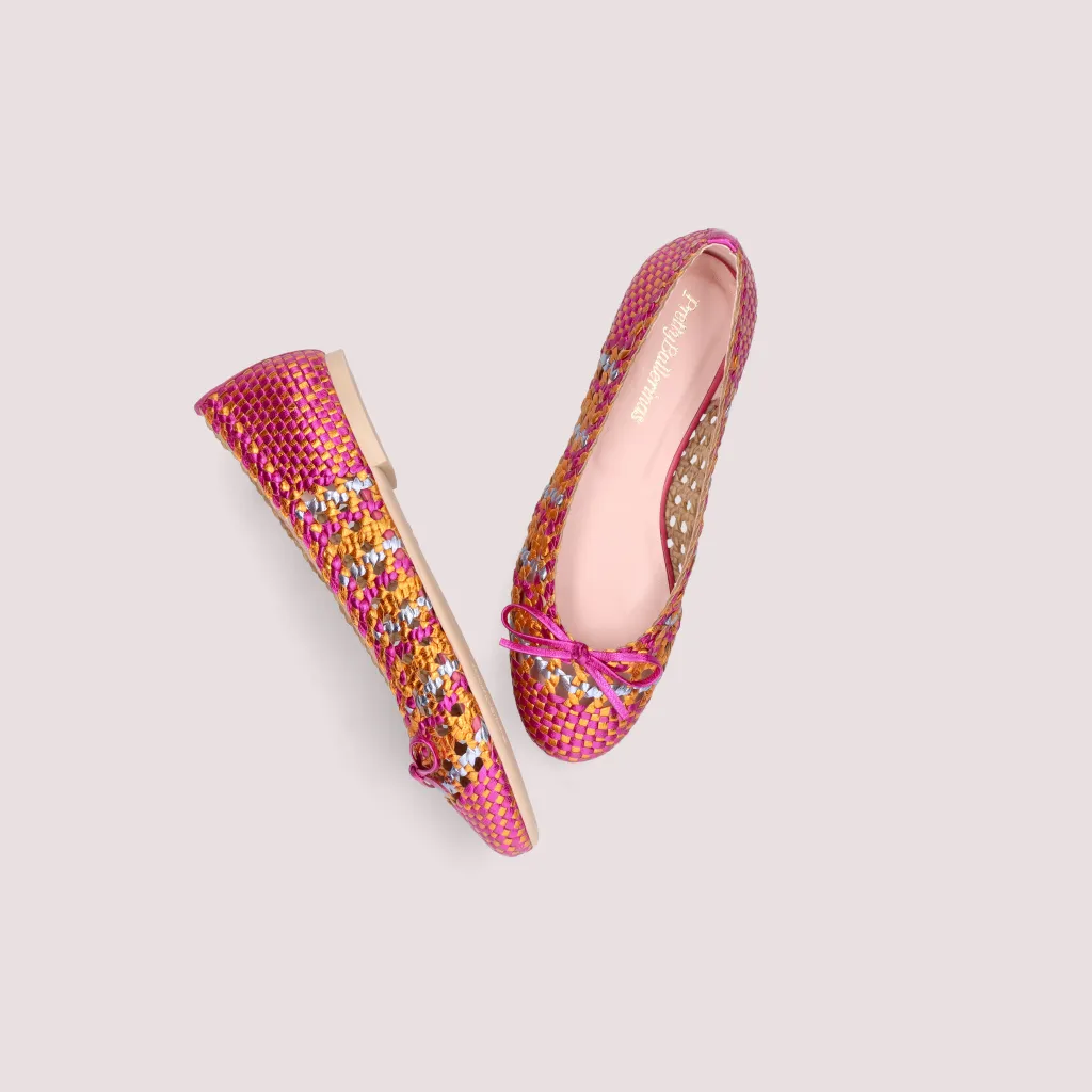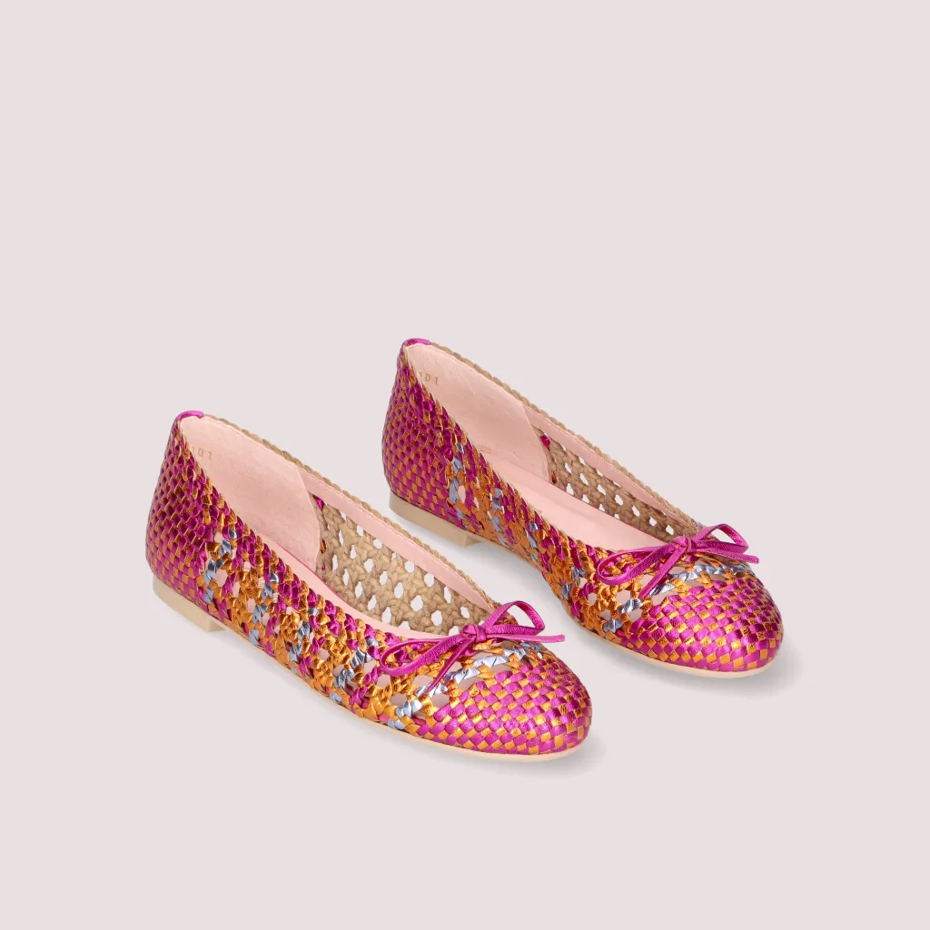 נעלי בלרינה מעור קלוע בצבעים עזים פוקסייה כתום וכסף מעוטר בפפיון דק בצבע פוקסיה