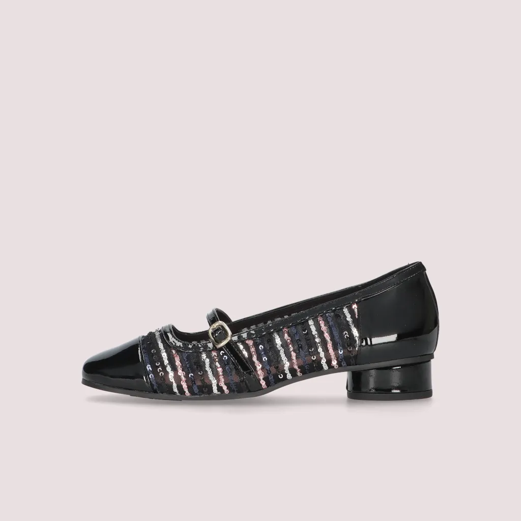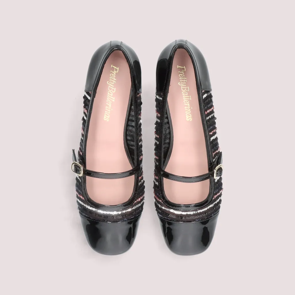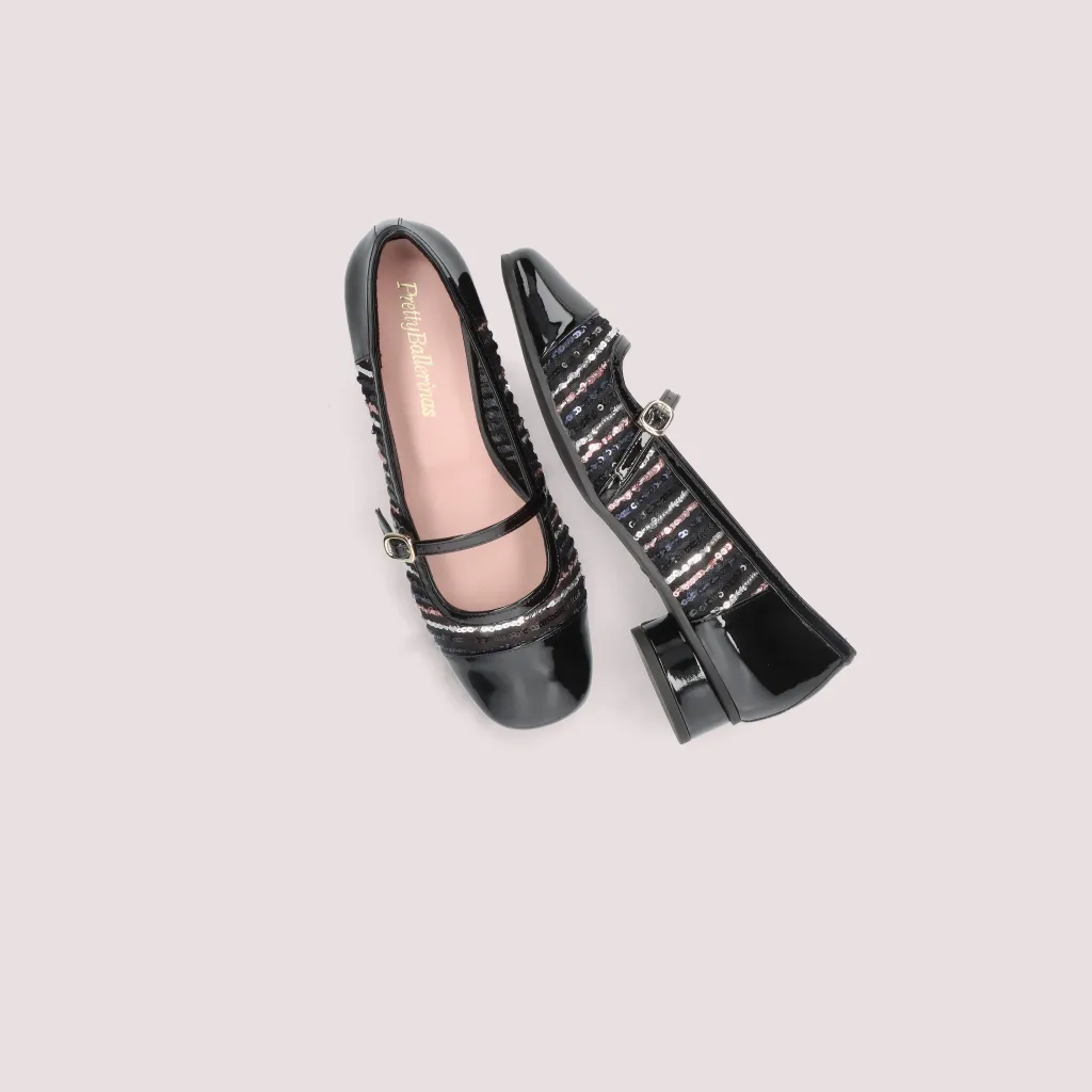 נעלי עקב מבד שקוף שחור שזור בפייטים שחורים כסופים וברונזה ורצועה שחורה. עם עקב בגובה של 3 סמ’