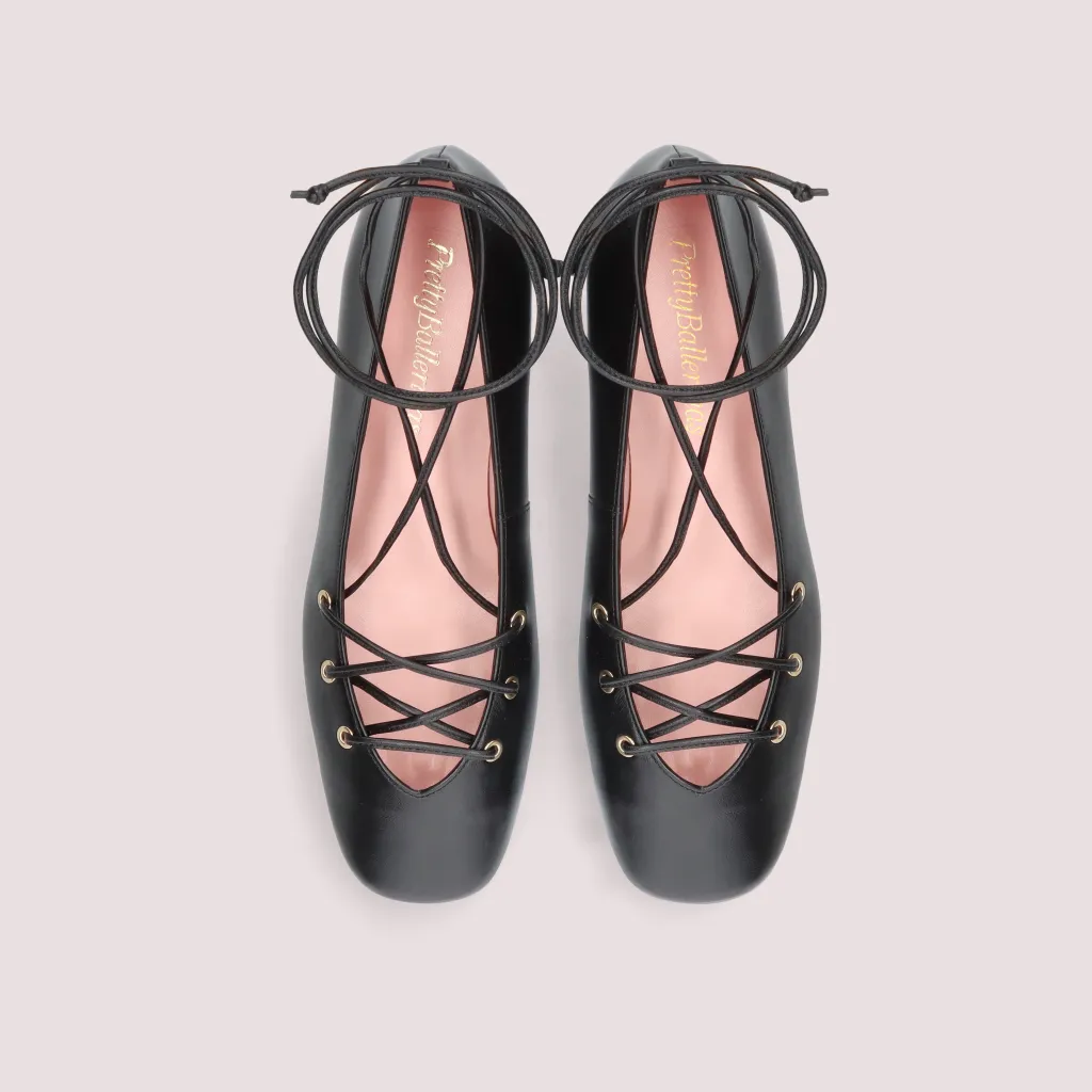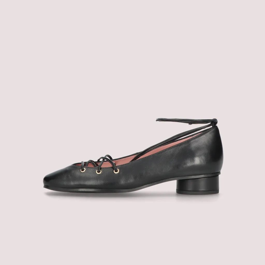 נעלי עקב מעור מט שחור עם שרוכים שחורים שמשרכים בקרסול ועקב בגובה של 3 סמ’