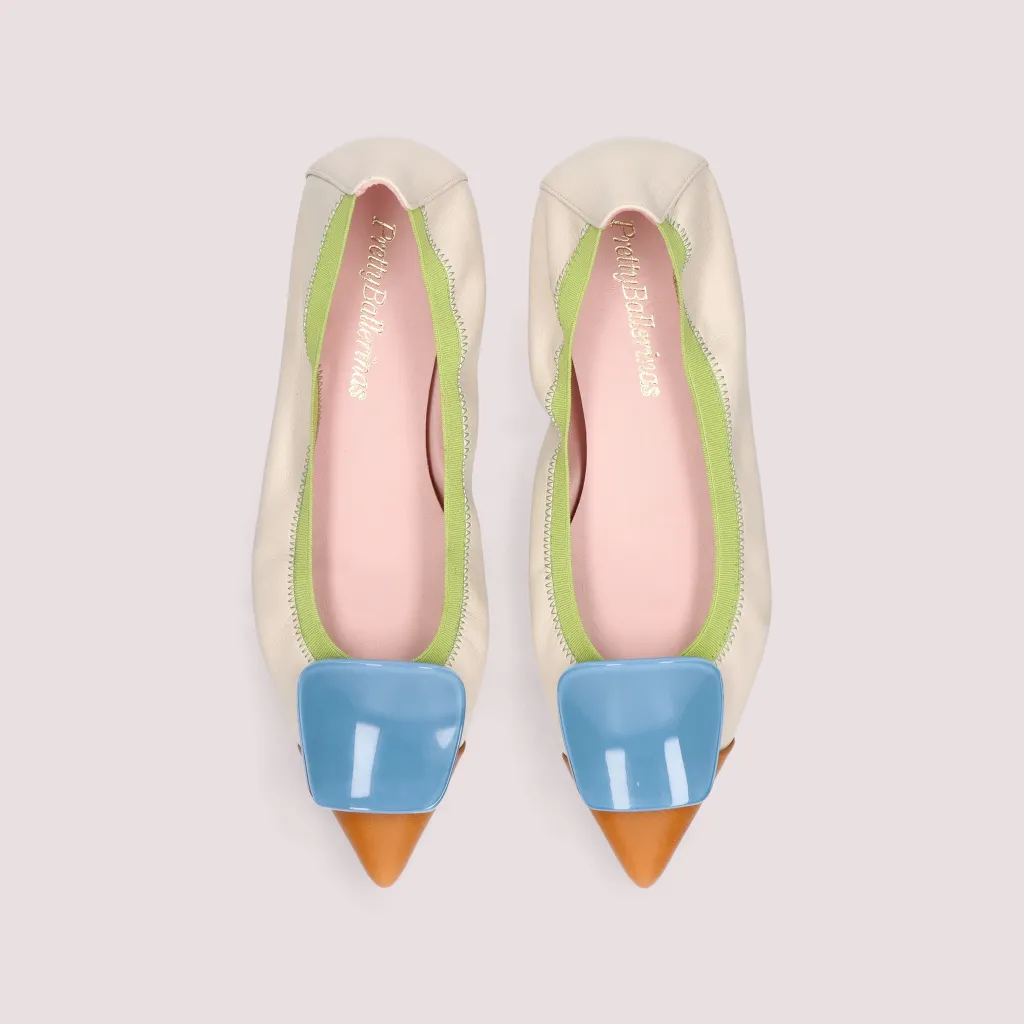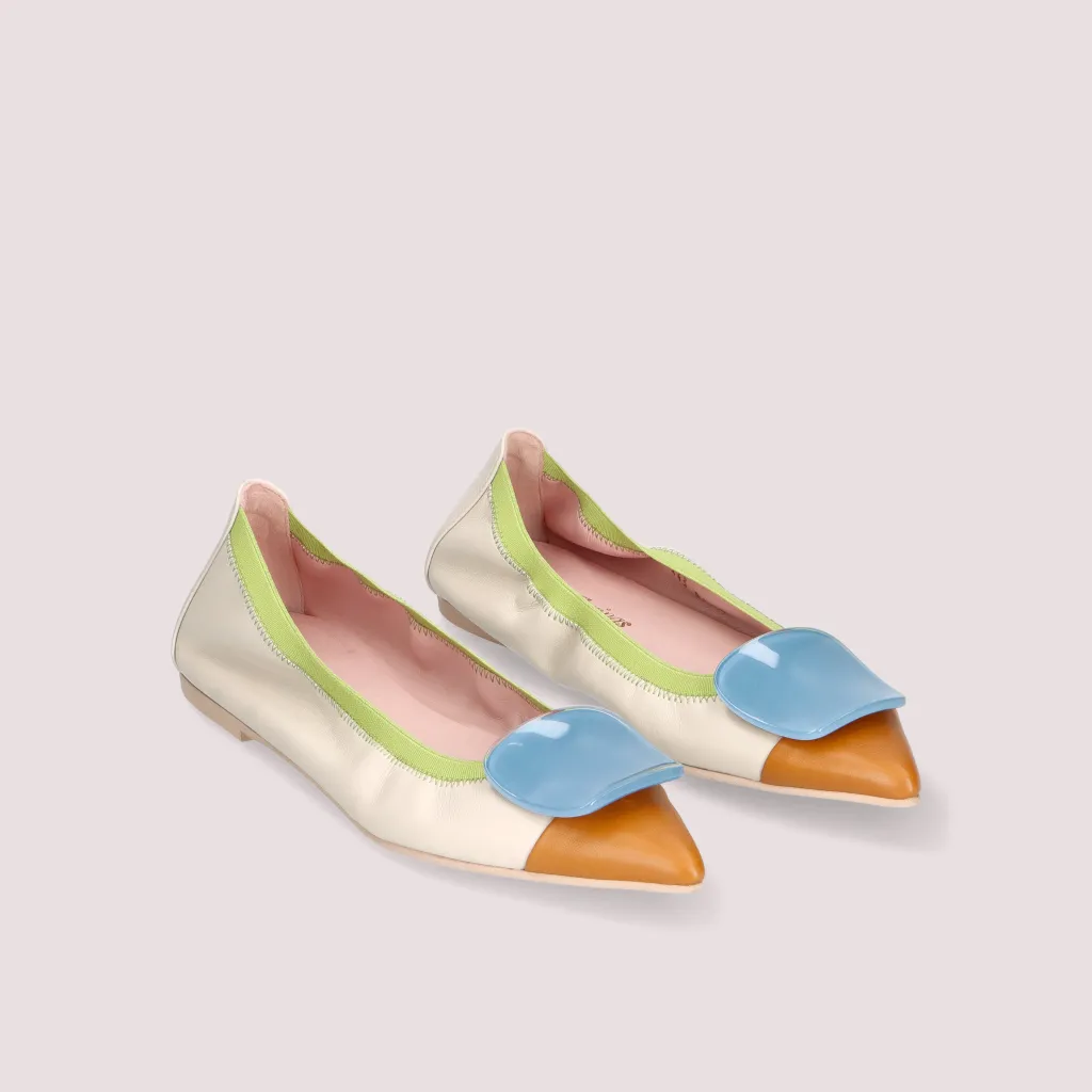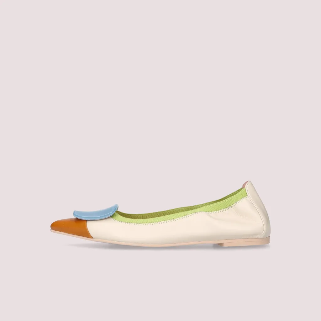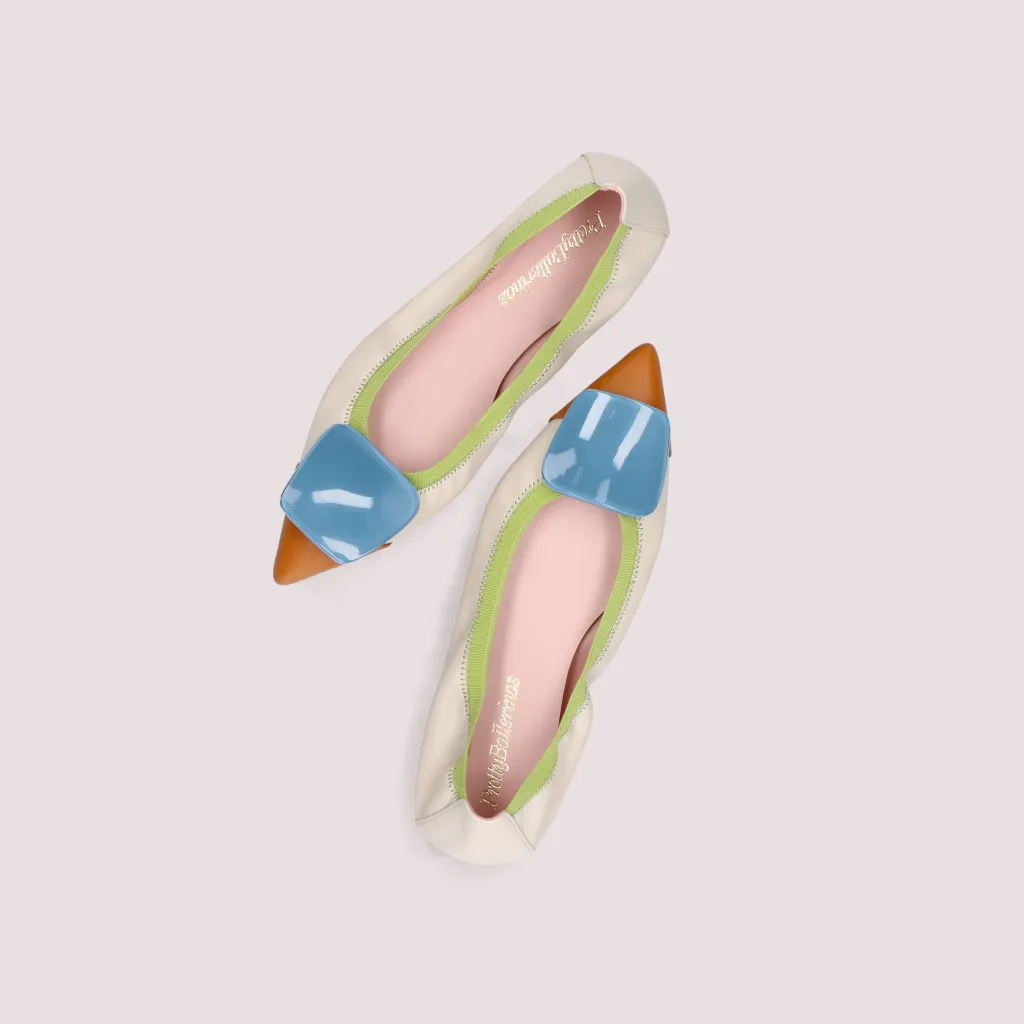 נעלי השירלי שלנו מעור מט בצבע פנינה וגומי ירוק ואבזם בצבע תכלת. עם חרטום שפיץ מעור מט בצבע חום. בדגם זה מומלץ לקחת מידה יותר