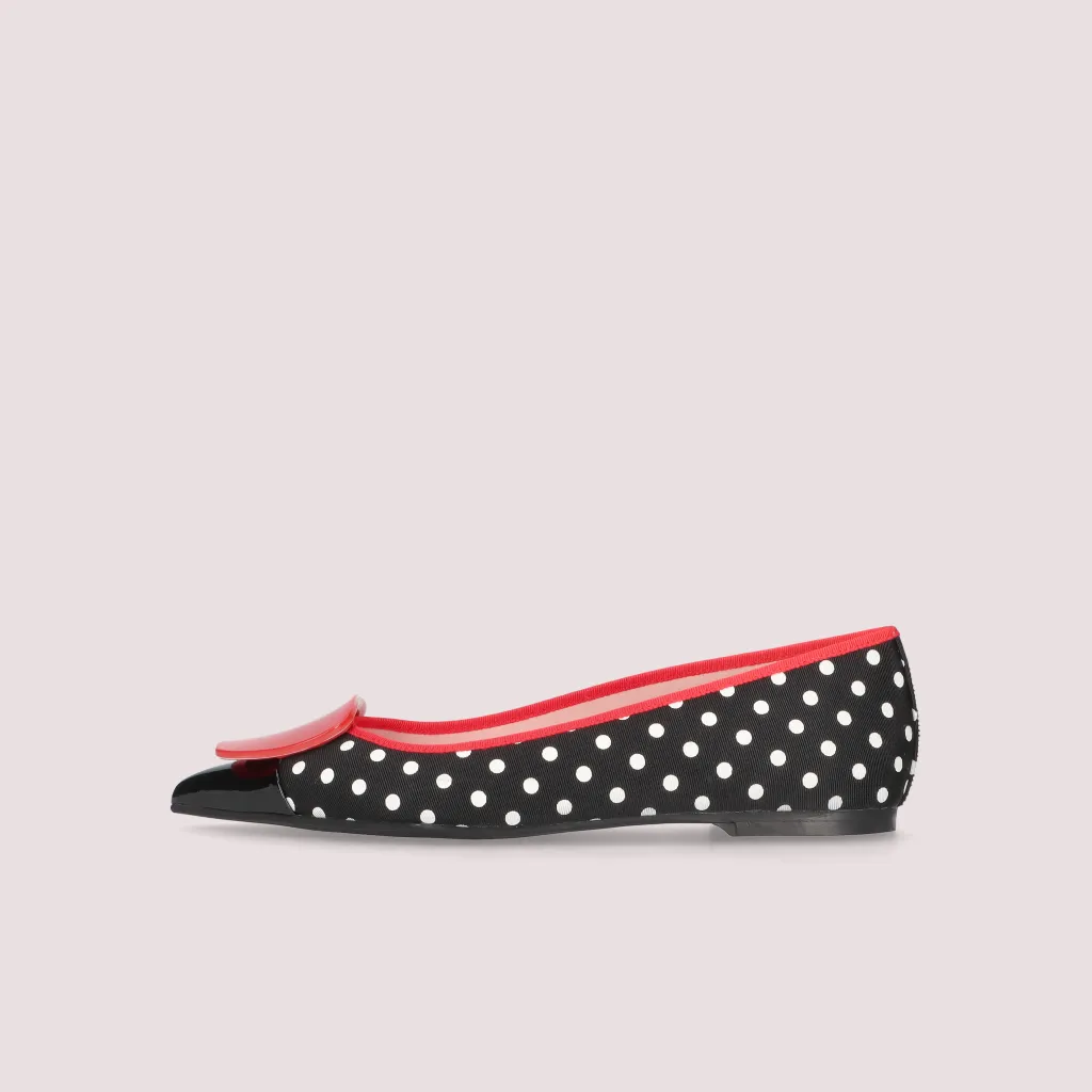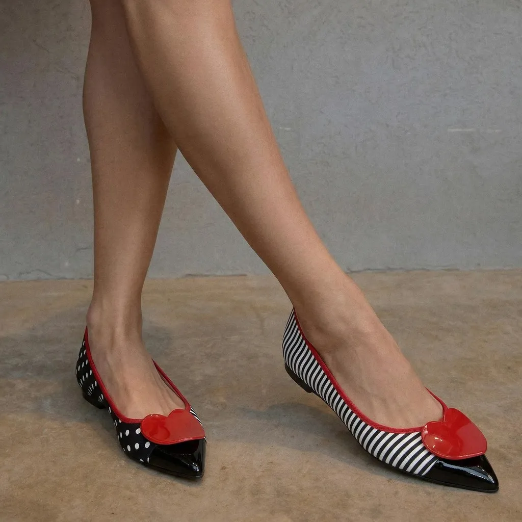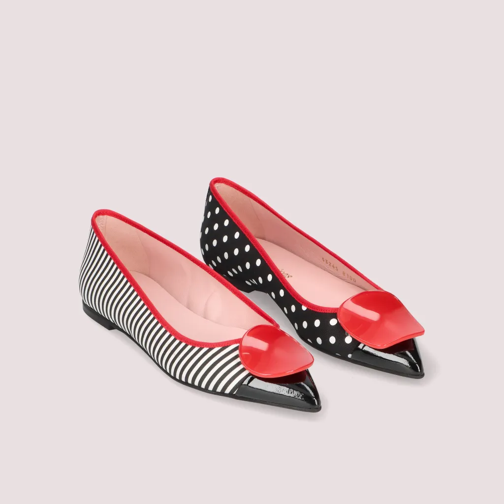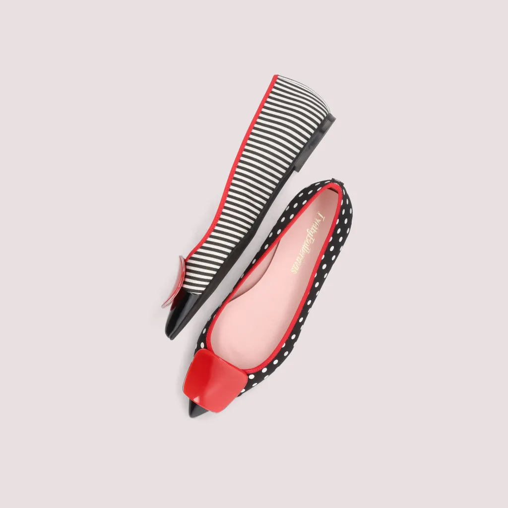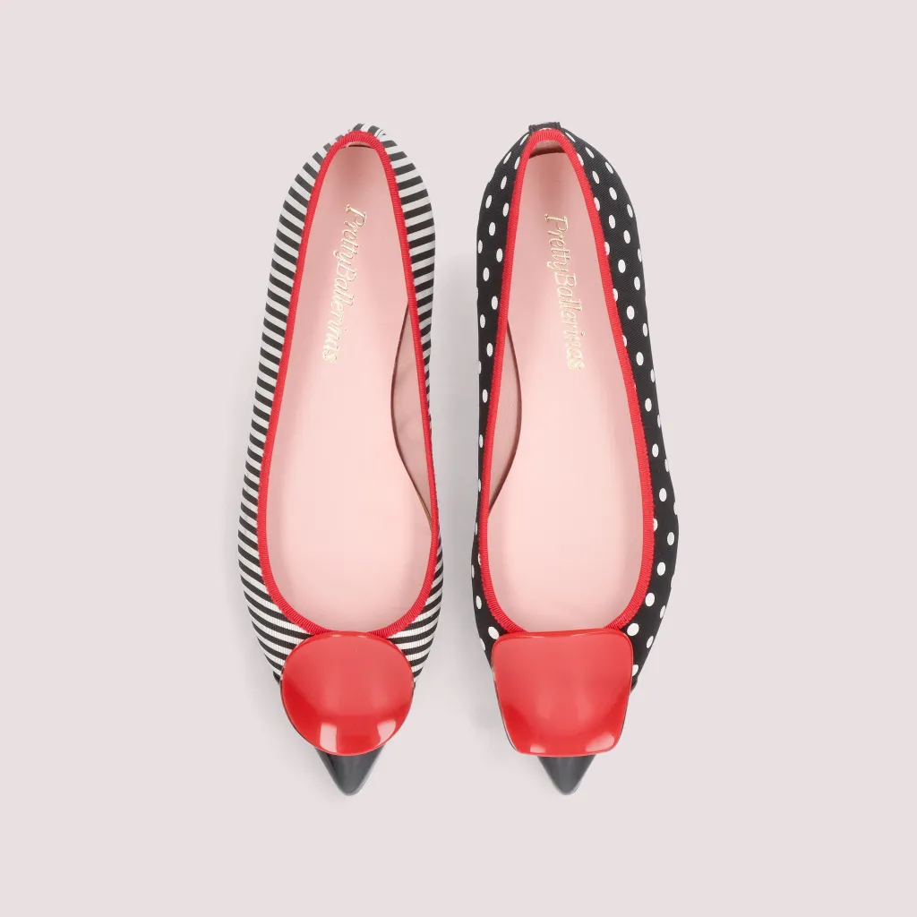 נעלי בלרינה מטקסטיל כאשר נעל אחת הדפס פסים כחול לבן והנעל שניה נקודות כחול לבן. עם חרטום שפיץ בלק כחול סרט ואבזם אדומים