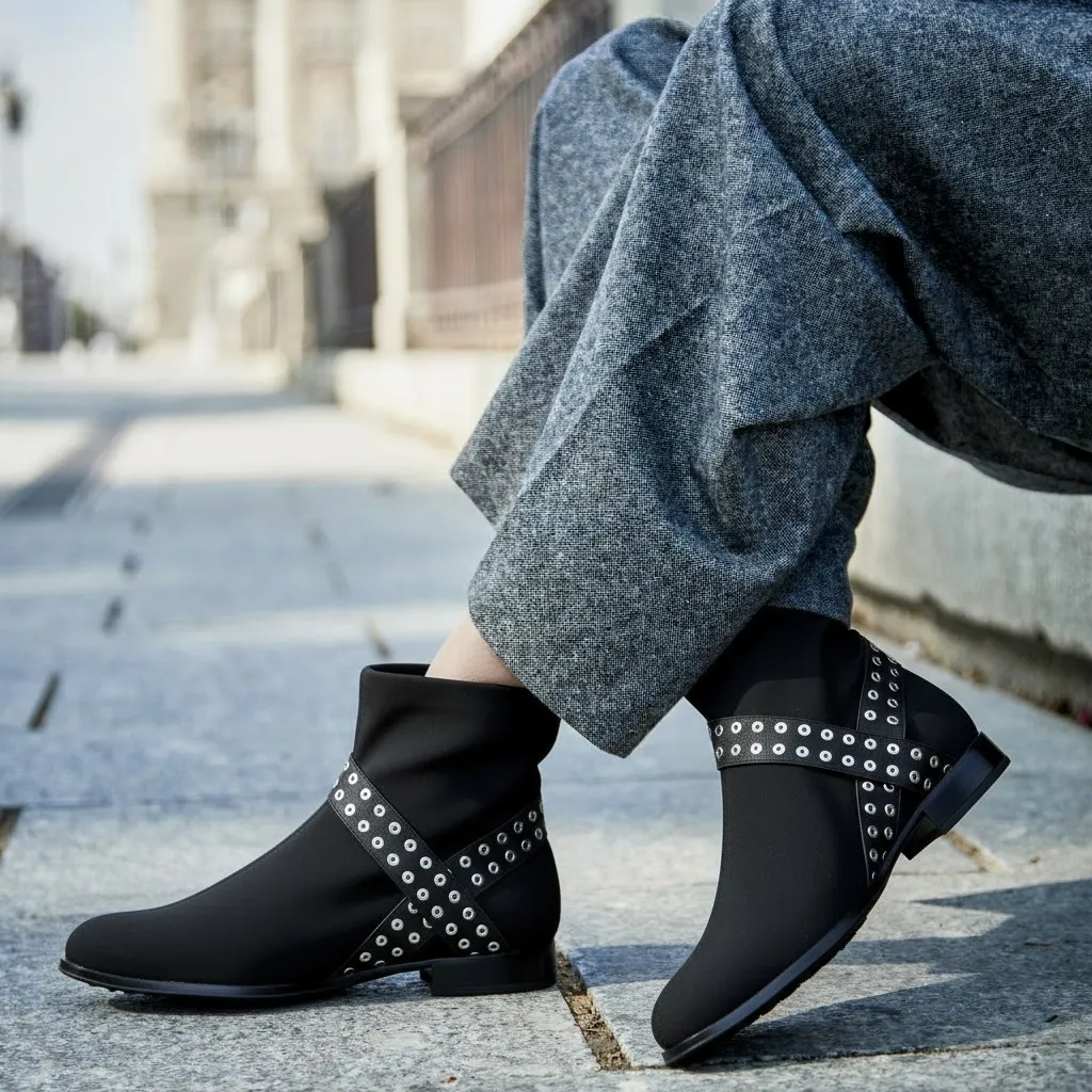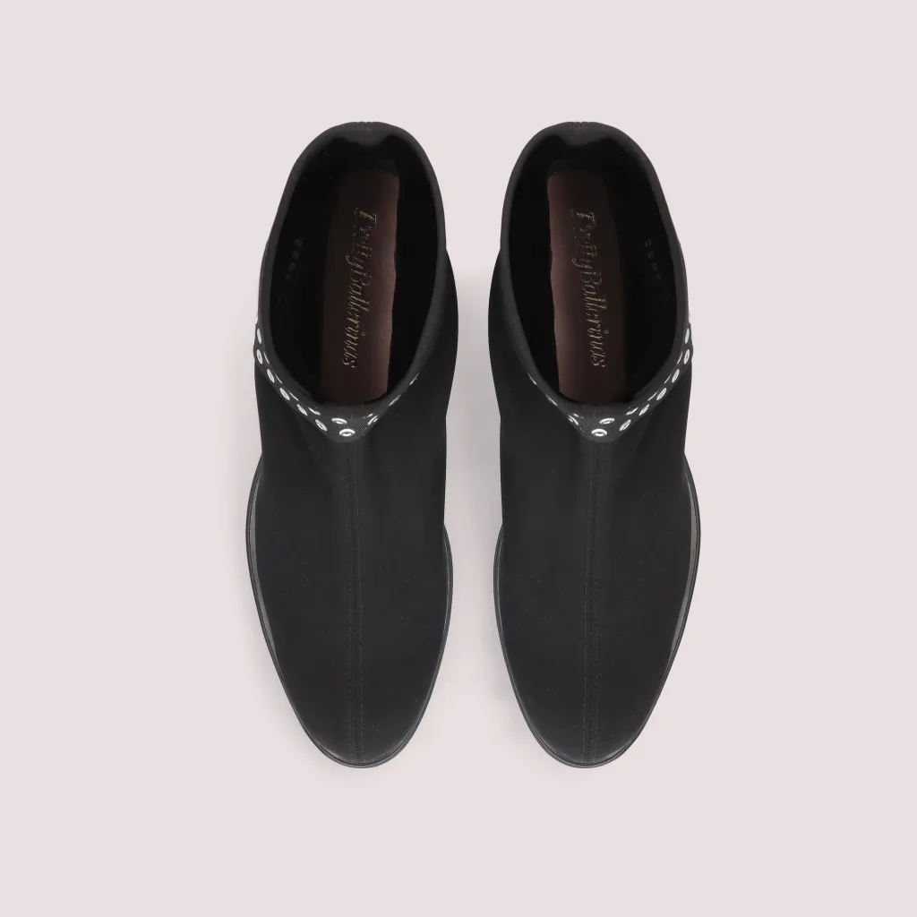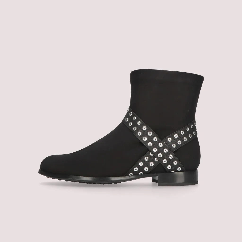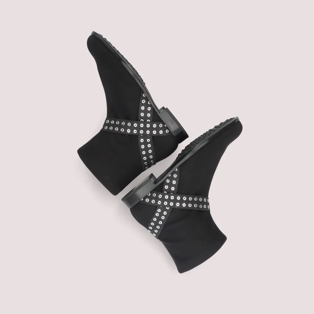 מגפון מסטרץ’ גומי שחור מעוטר ברצועה צולבת על הקרסול בצבע שחור שזורה בניטים
