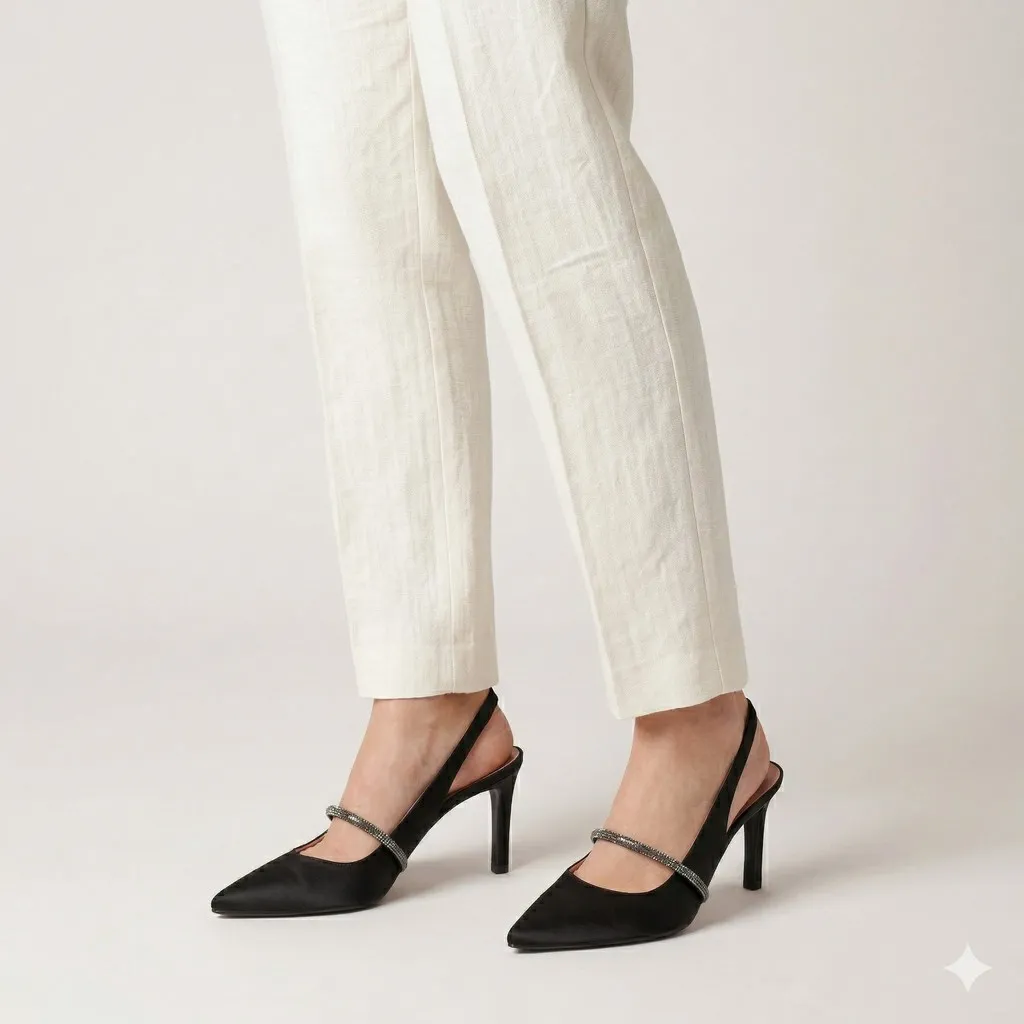 נעלי עקב בגובה 7 ס”מ פתוחות מאחור, עשויות טקסטיל סאטן שחור, מעוטר ברצועת אבנים שחורות קטנות, עם חרטום שפיץ – נעליים מדויקות לאירוע הקרוב שלכן