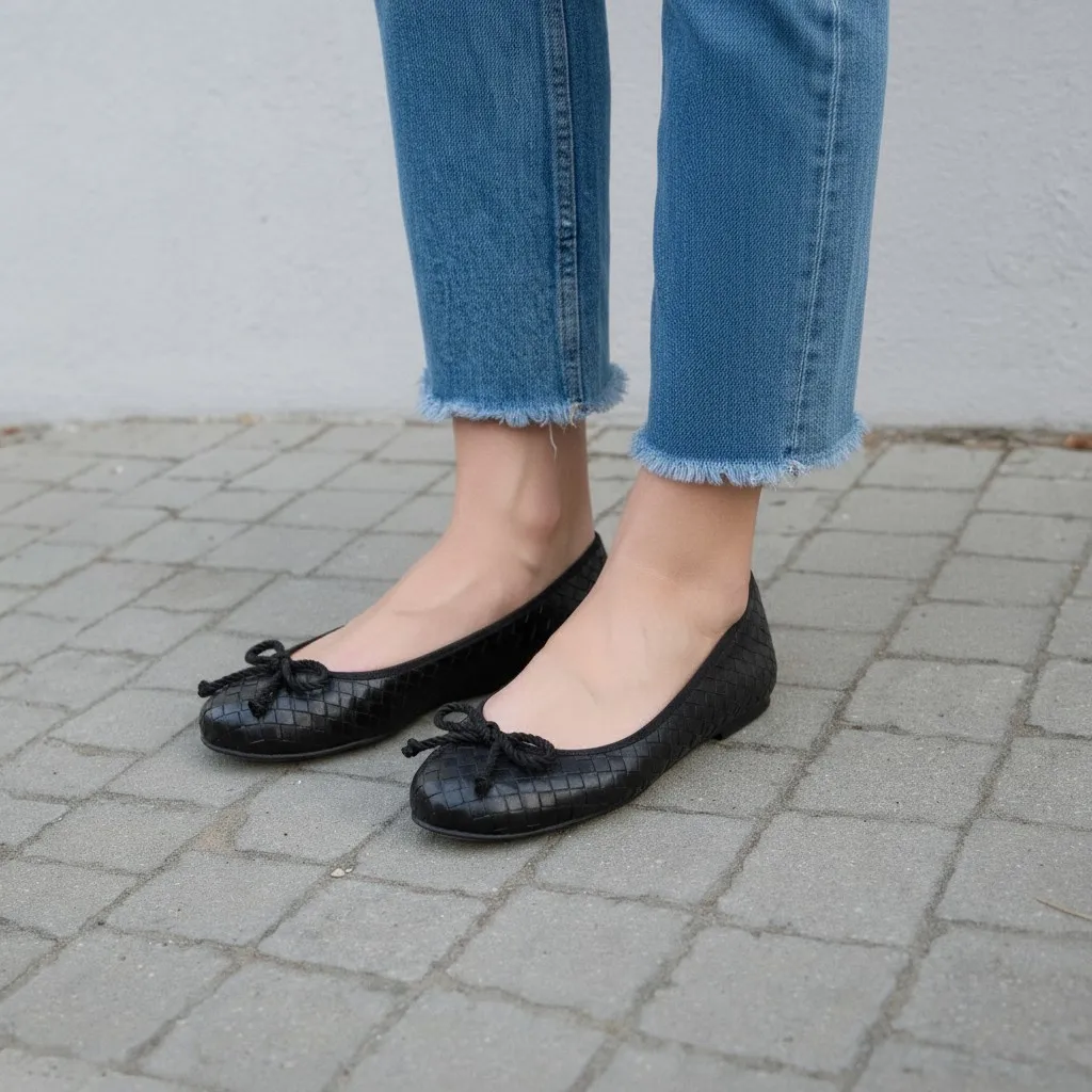 נעלי בלרינה מעור קלוע בשחור וסרט ושרוך שחורים