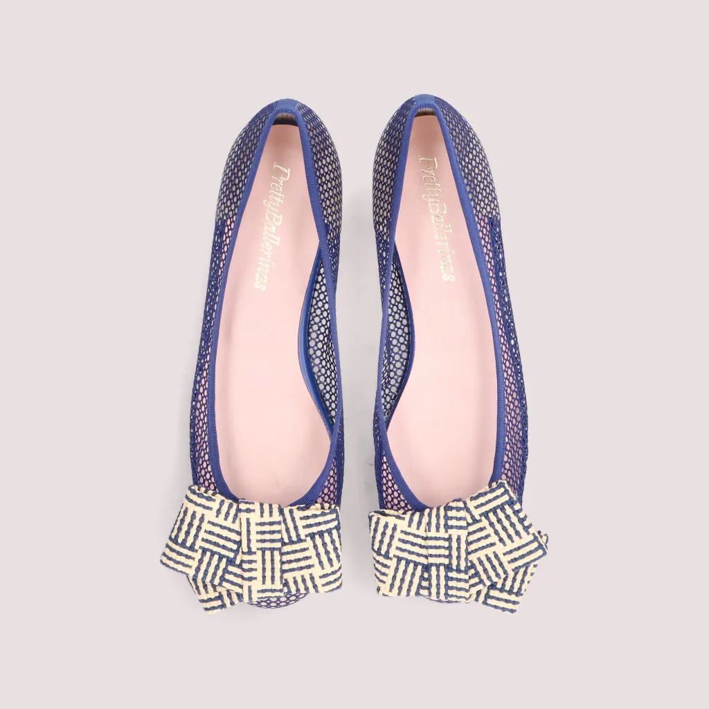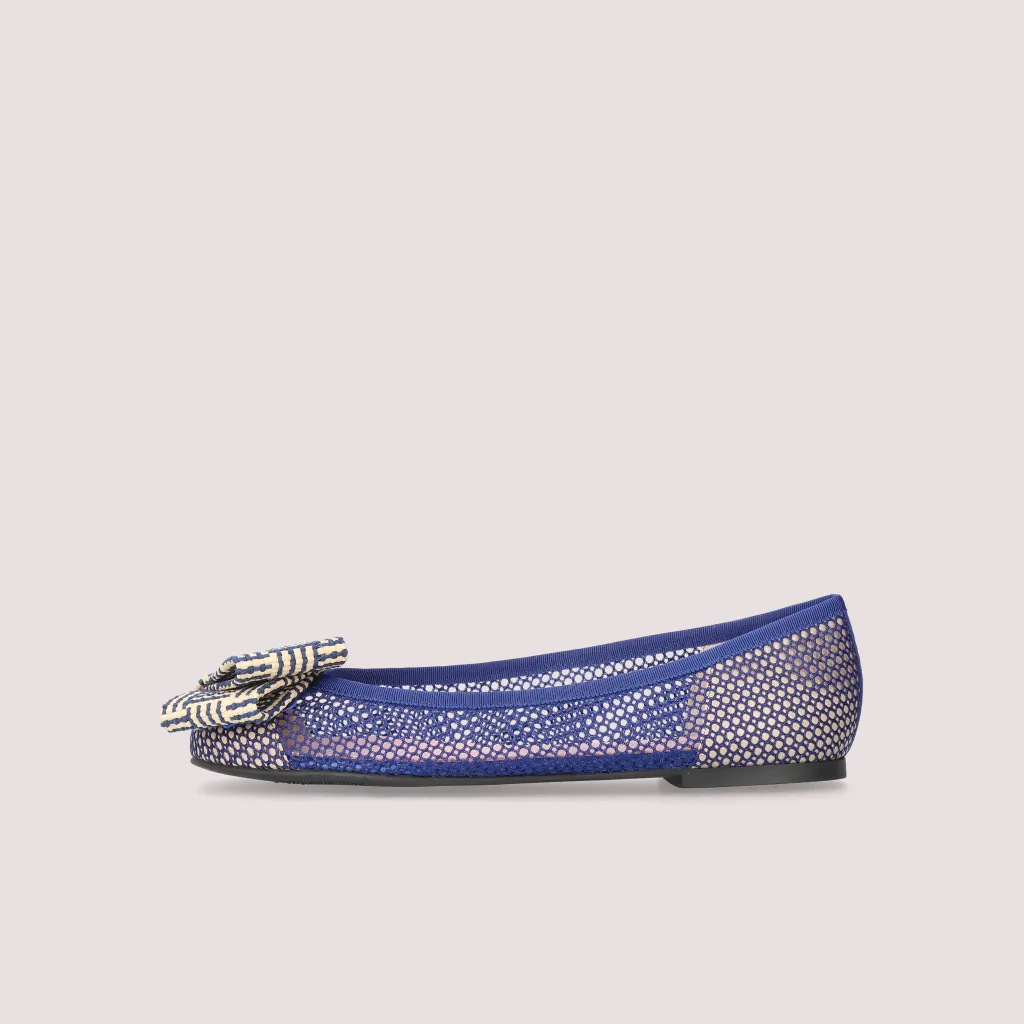 נעלי בלרינה מרשת בצבע כחול רויאל מעוטר בפפיון ראפיה גדול בפסים של כחול ואבן . בדגם זה מומלץ להזמין חצי מידה יותר מהרגיל