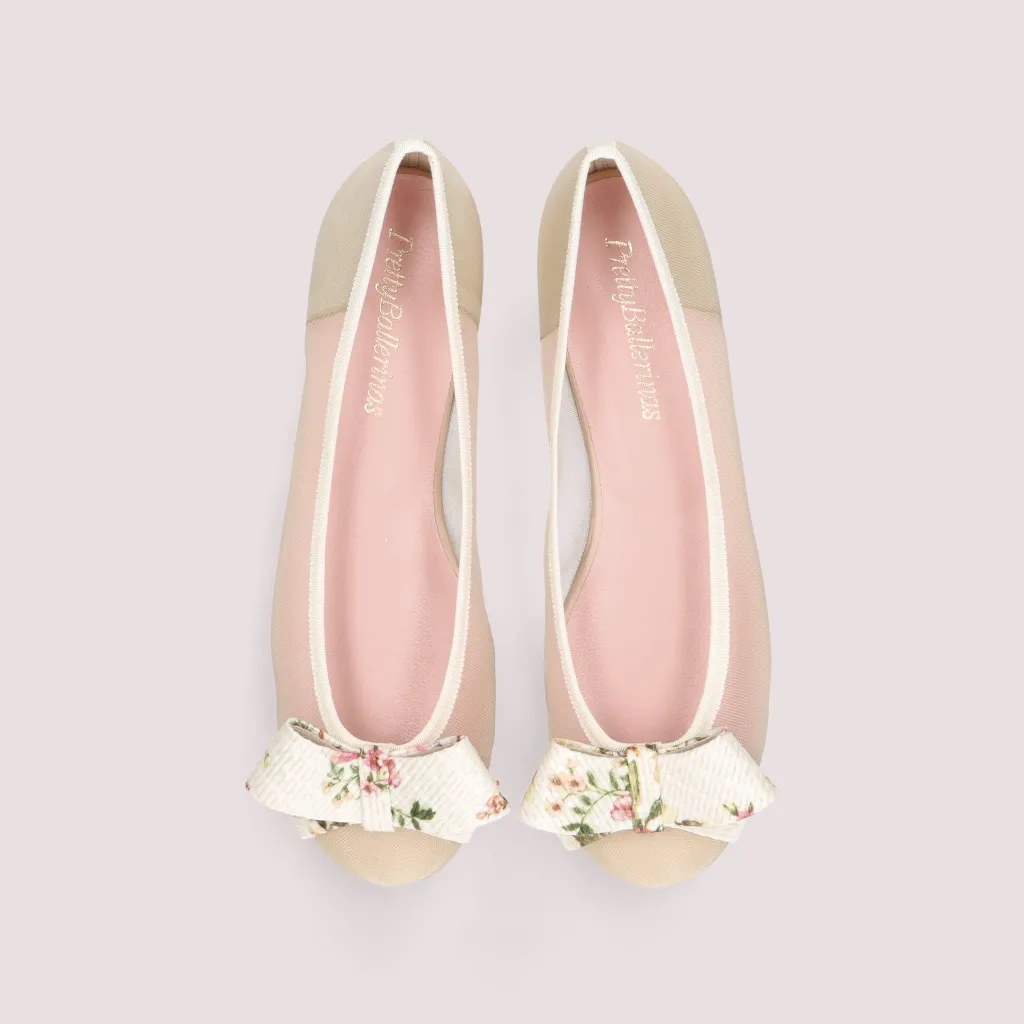 נעלי בלרינה מרשת בצבע אבן מעוטר בפפיון ראפיה בצבע פנינה בהדפס פרחים