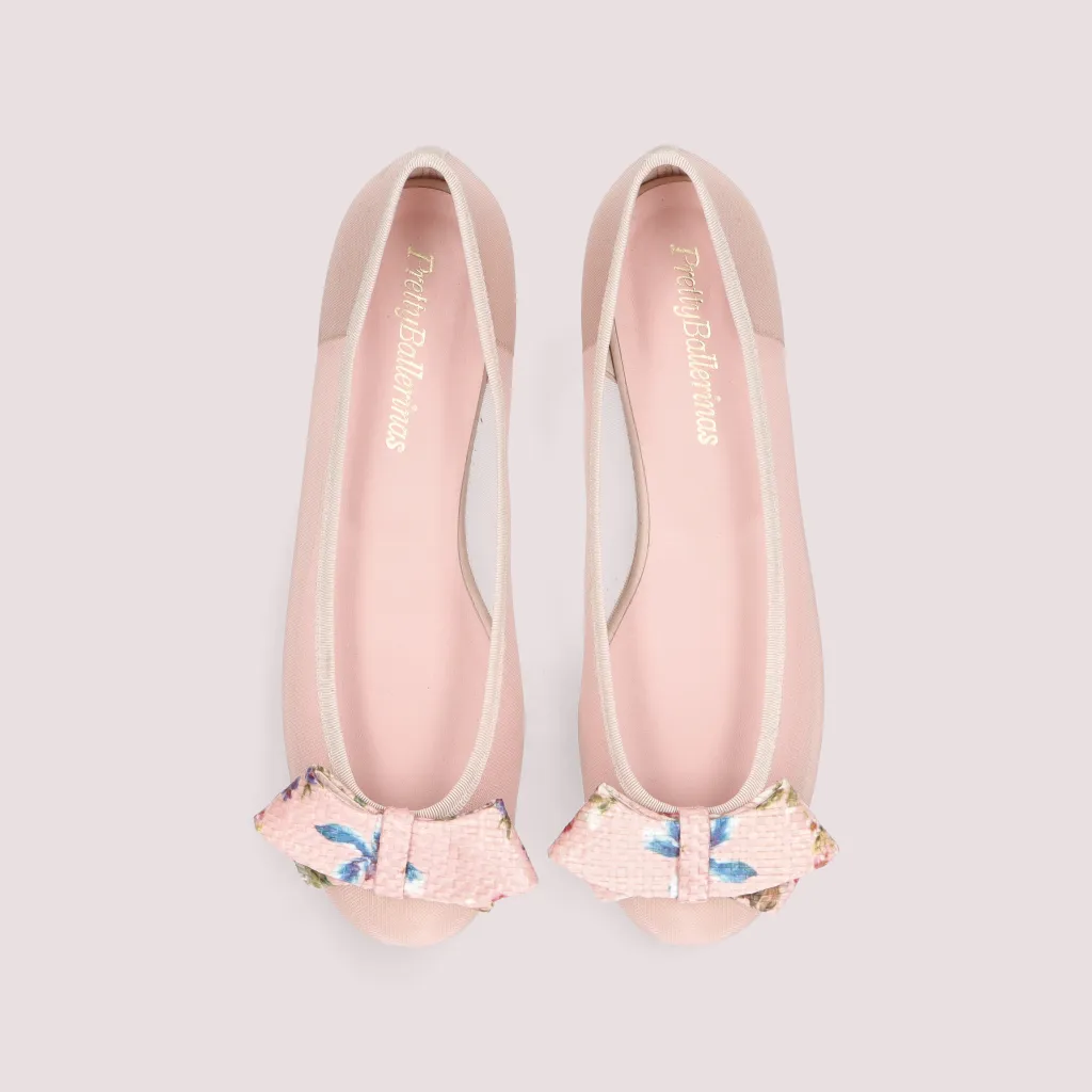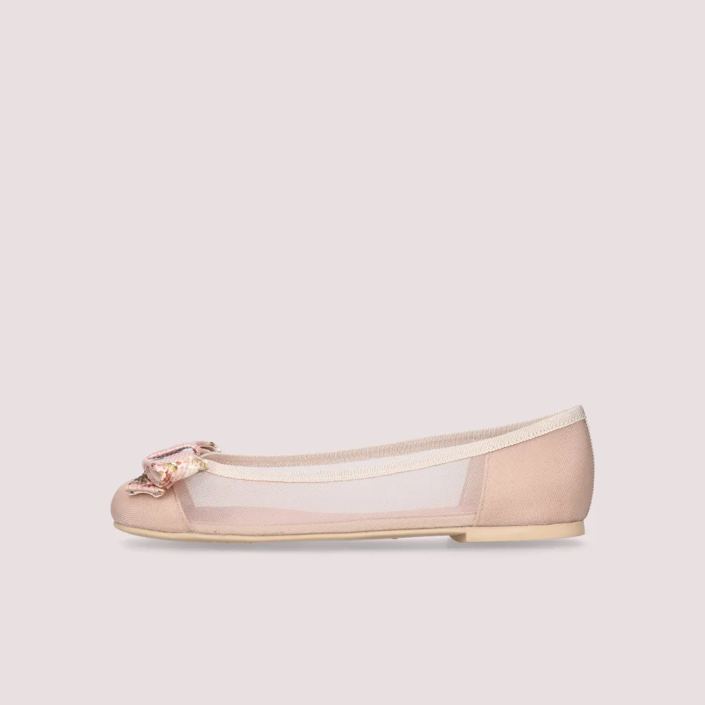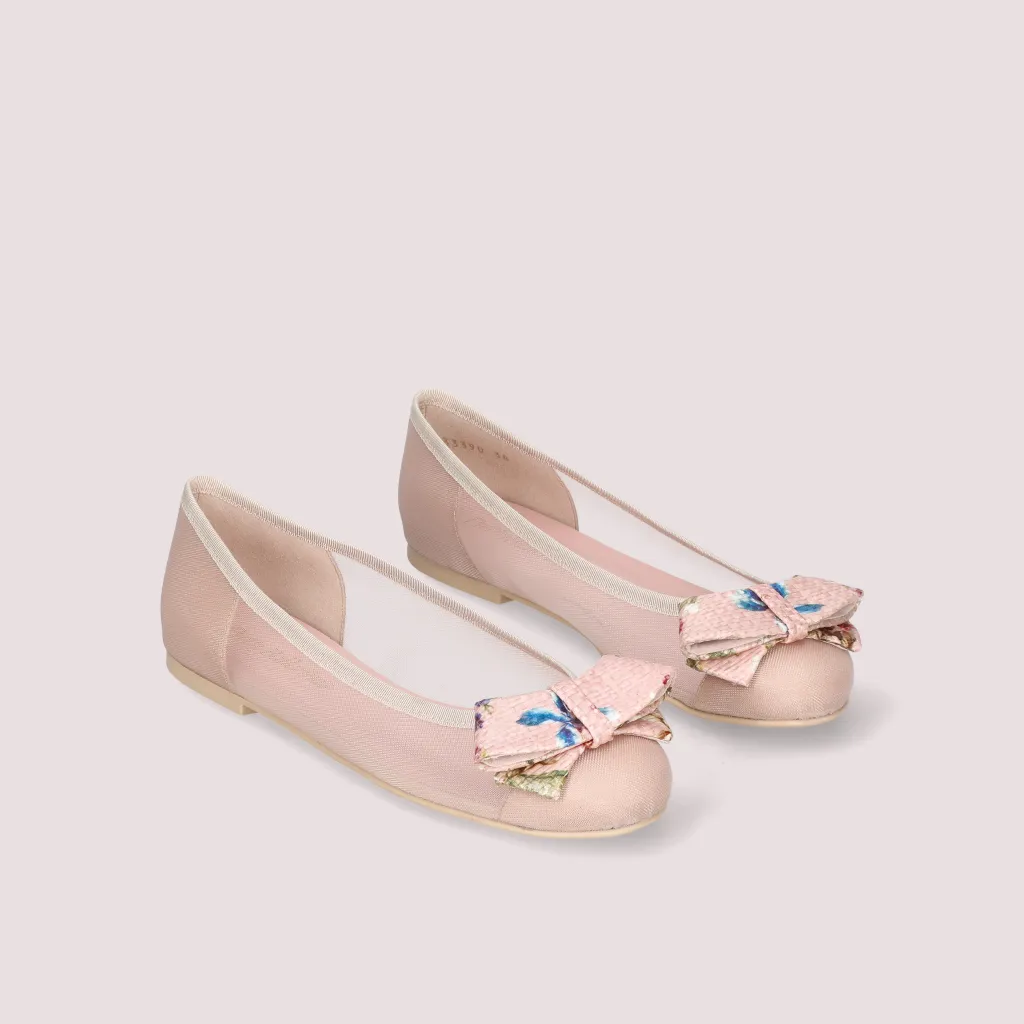 נעלי בלרינה מרשת בצבע ניוד מעוטר בפפיון ראפיה בצבע ורוד בהדפס פרחים