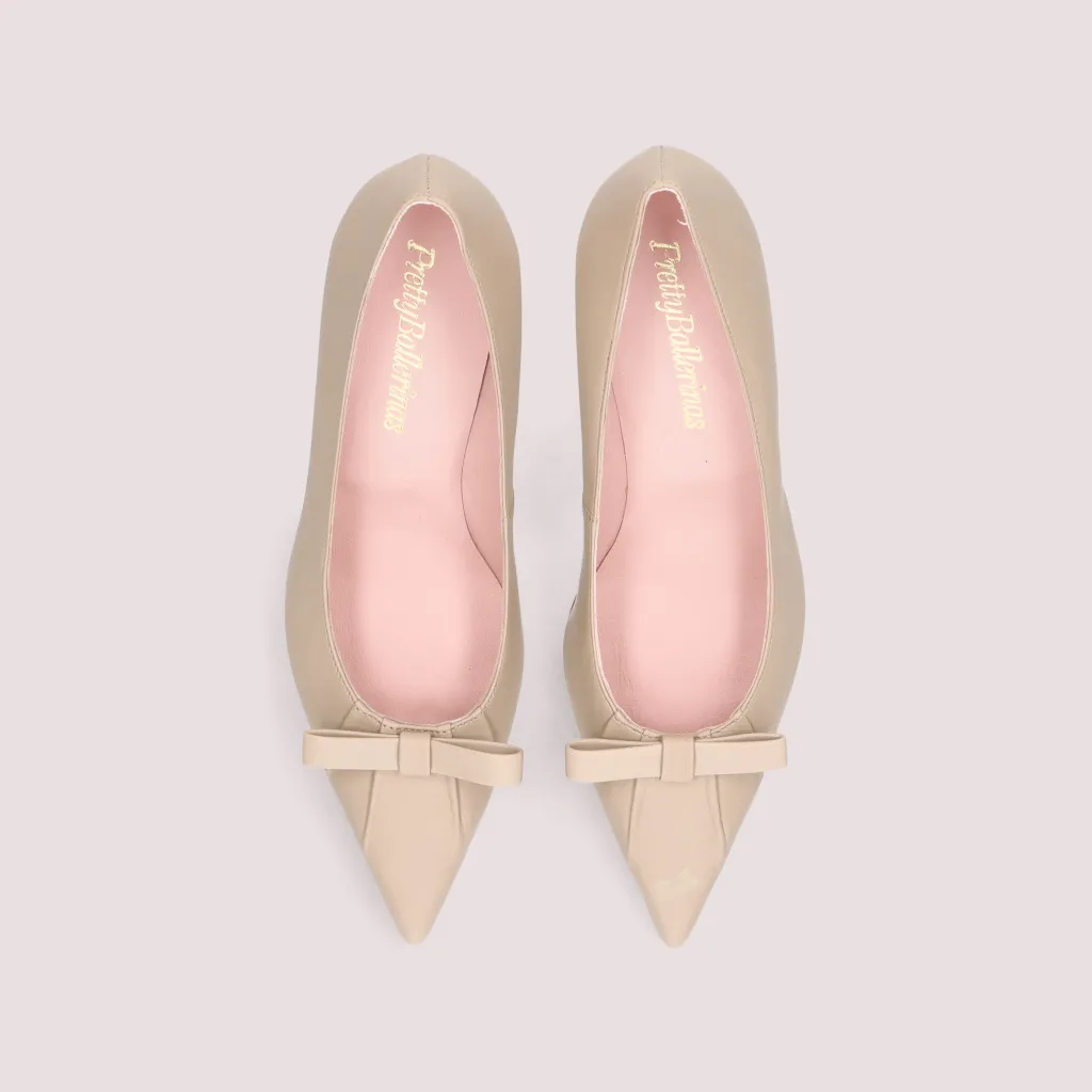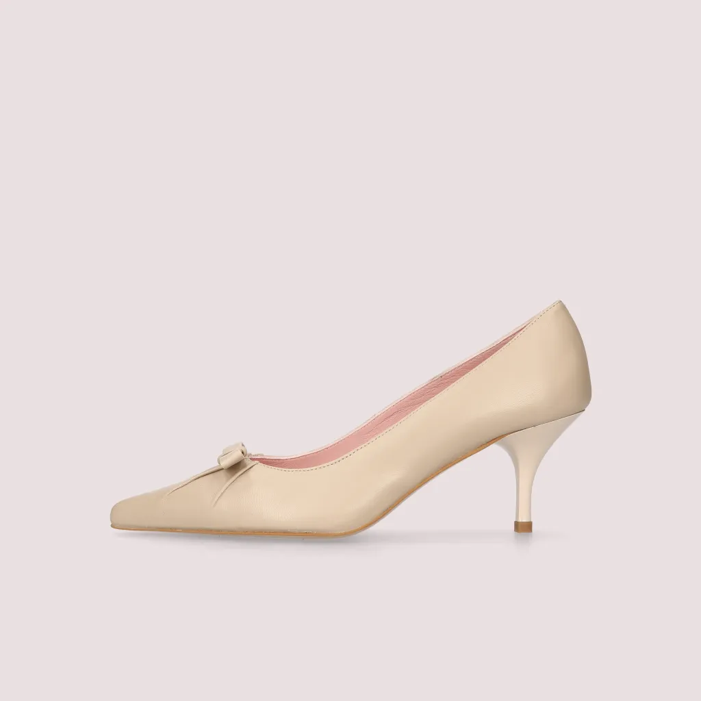 נעלי עקב מעור מט בצבע בז’ עם פפיון. עם עקב לק תואם בגובה של 6 ס”מ וחרטום שפיץ. בדגם זה מומלץ להזמין חצי מידה יותר מהרגיל