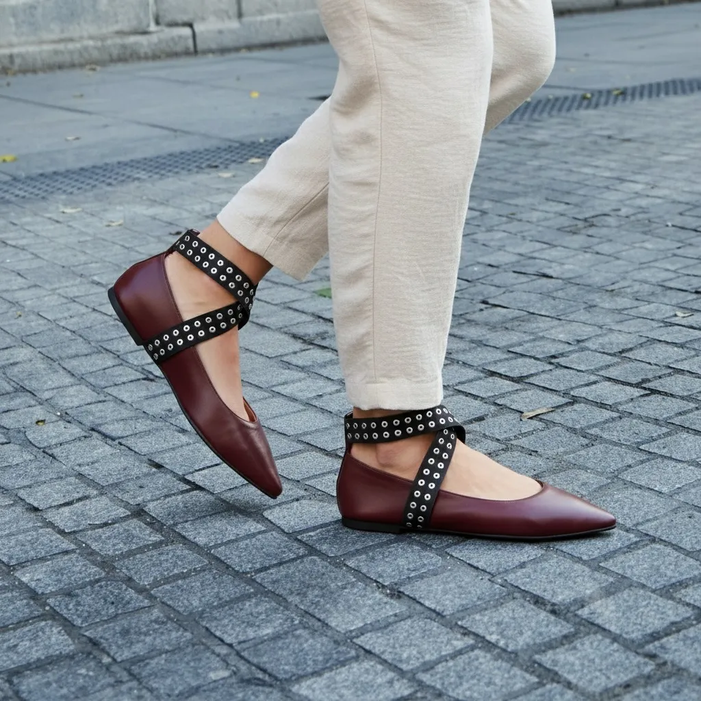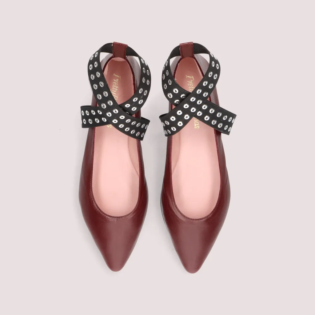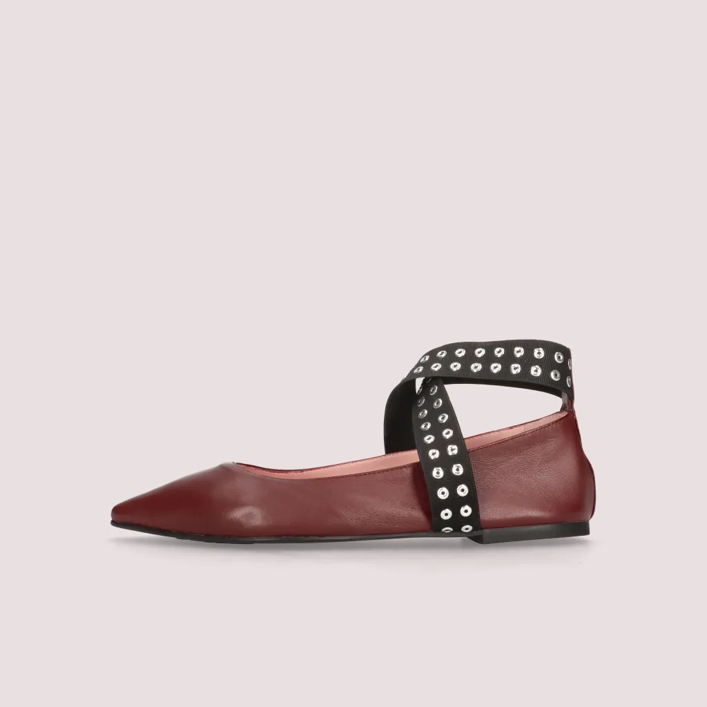 נעלי בלרינה מעור מט בורדו עם רצועת גומי שחורה סביב לקרסול שזורה בניטים כסופים וחרטום שפיץ הן נעליים דרמטיות ובעלות נוכחות, שמוסיפות עומק וצבע ייחודי לכל הופעה ומעניקות מראה שיקי ובטוח בעצמו
