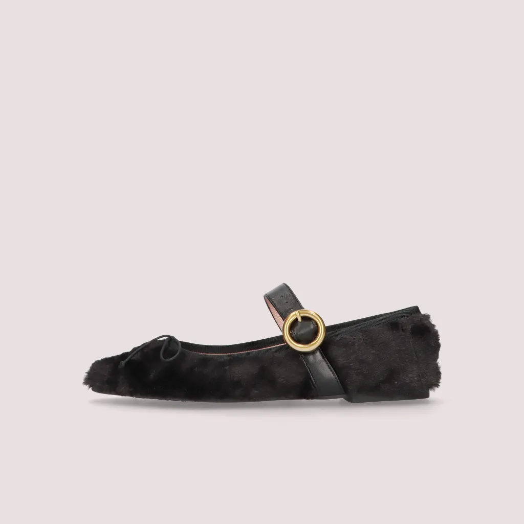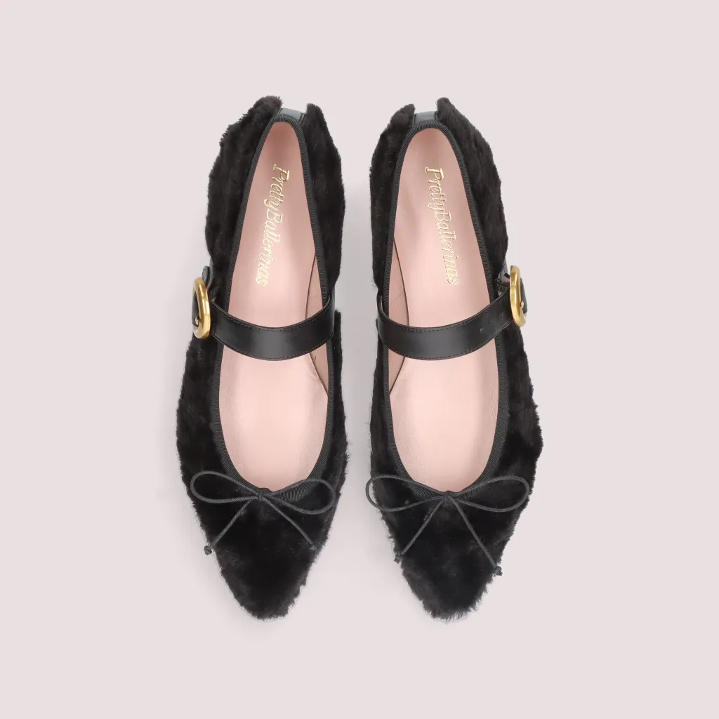נעלי בלרינה מדמוי פרווה בצבע שחור עם רצועה שחורה. עם אבזם עגול זהב מט וחרטום שפיץ. בדגם זה מומלץ להזמין חצי מידה יותר מהרגיל